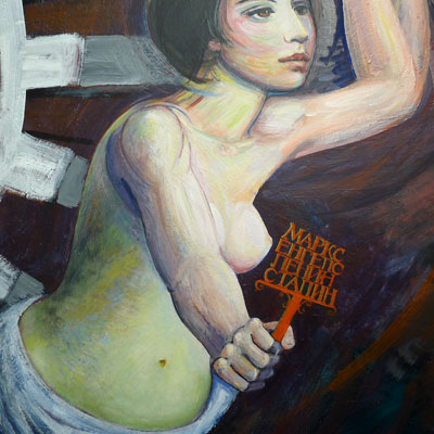 Detail from Philip Stein’s Progress to Come, 1972. Museum of Latin American Art. The Cyrillic words on the standard are the names of the great movement forebearers: Marx, Engels, Lenin and Stalin.